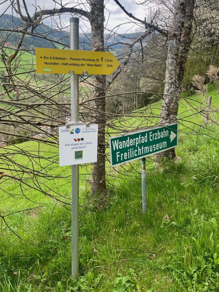 Entlang des Wanderweges vermitteln 4 abwechslungsreiche Stationen die Grundprinzipien der Kreislaufwirtschaft – von Abfallvermeidung über Wiederverwertung bis hin zu einem Leben ohne Müll. Durch anschauliche Infotafeln mit QR-Codes zu vertiefenden Videos wird das abstrakte Thema greifbar gemacht.