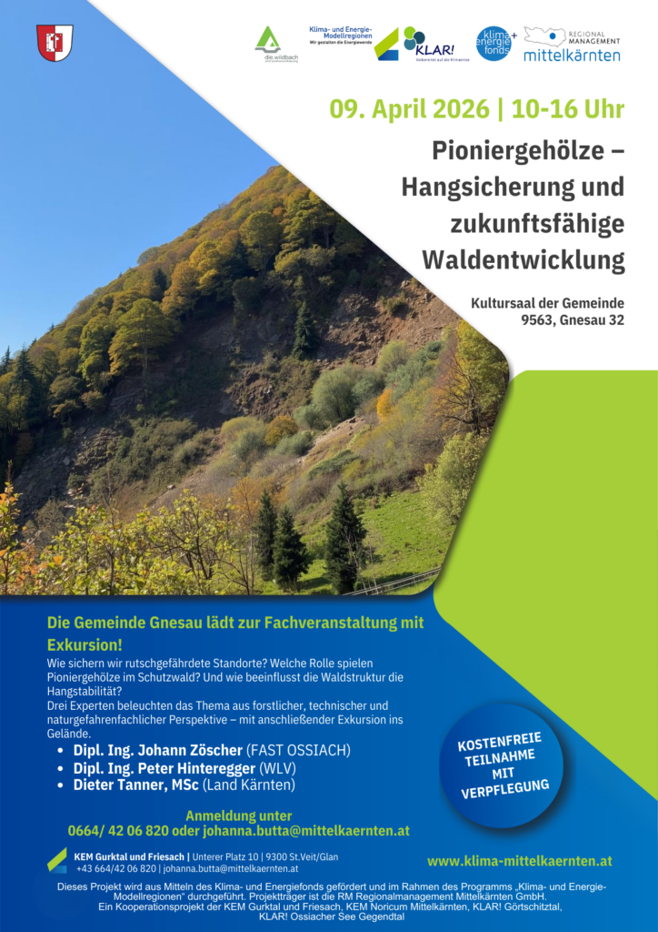 In Gnesau findet am 09. April 2026 erstmalig eine Fachveranstaltung zum Thema Pioniergehölze statt. Fachexperten von unterschiedlichen Organisationen werden vor Ort vertreten sein, um ins Thema einzuführen – danach gibt es eine Exkursion zu Gräben vor Ort um das Fachliche zu vertiefen!