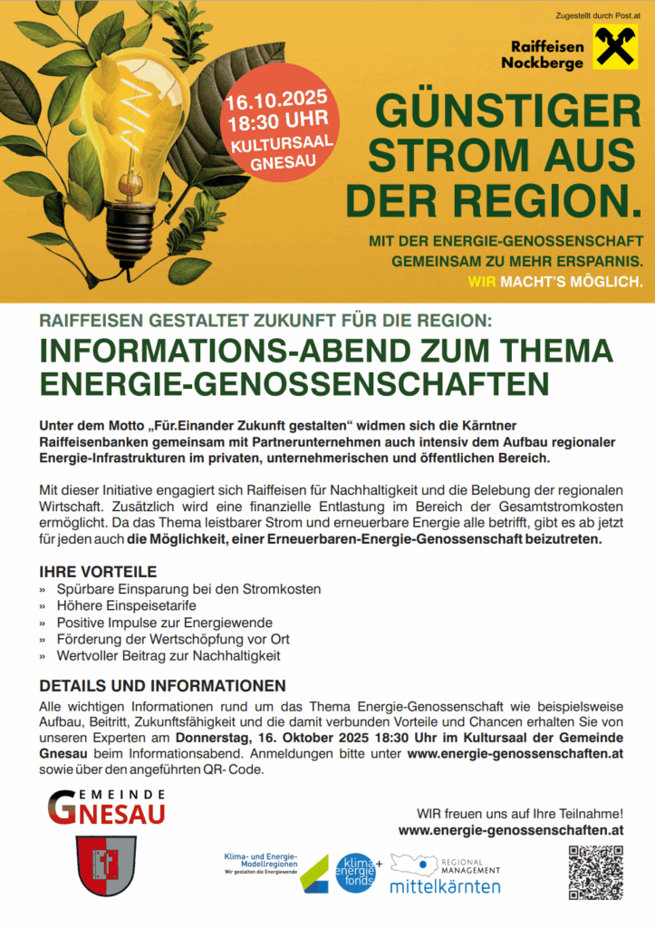 Gnesau. Am 16. Oktober um 18:30 Uhr findet im Gemeindesaal in Gnesau eine Informationsveranstaltung zum Thema Energiegenossenschaften statt. Die Raiffeisen Nockberge informiert über ihre Rolle als Partner der Erneuerbaren-Energie-Genossenschaft und über Möglichkeiten, Strom gemeinschaftlich zu beziehen oder einzuspeisen. Thematisiert werden Vorteile wie geringere Stromkosten, höhere Einspeisetarife und regionale Wertschöpfung. Die Klima- und Energie-Modellregion Gurktal und Friesach beteiligt sich als Projektpartner und setzt damit einen weiteren Impuls für die Energiewende vor Ort.