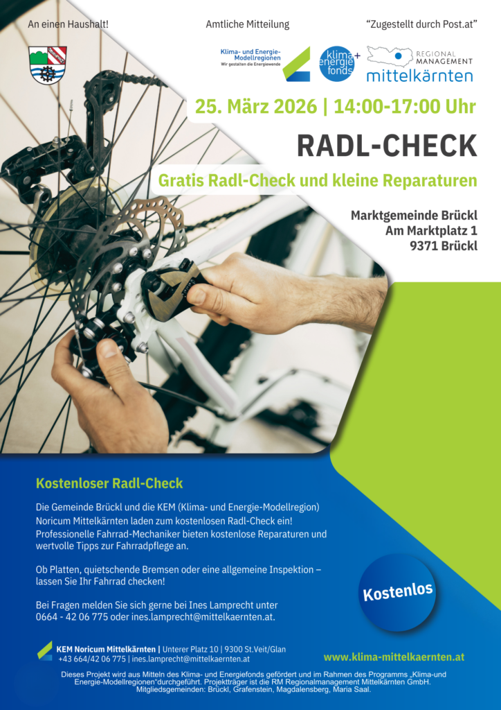 Am 25.03.2026 von 14:00 bis 17:00 Uhr findet am Marktplatz in Brückl ein kostenloser Radl-Check statt.