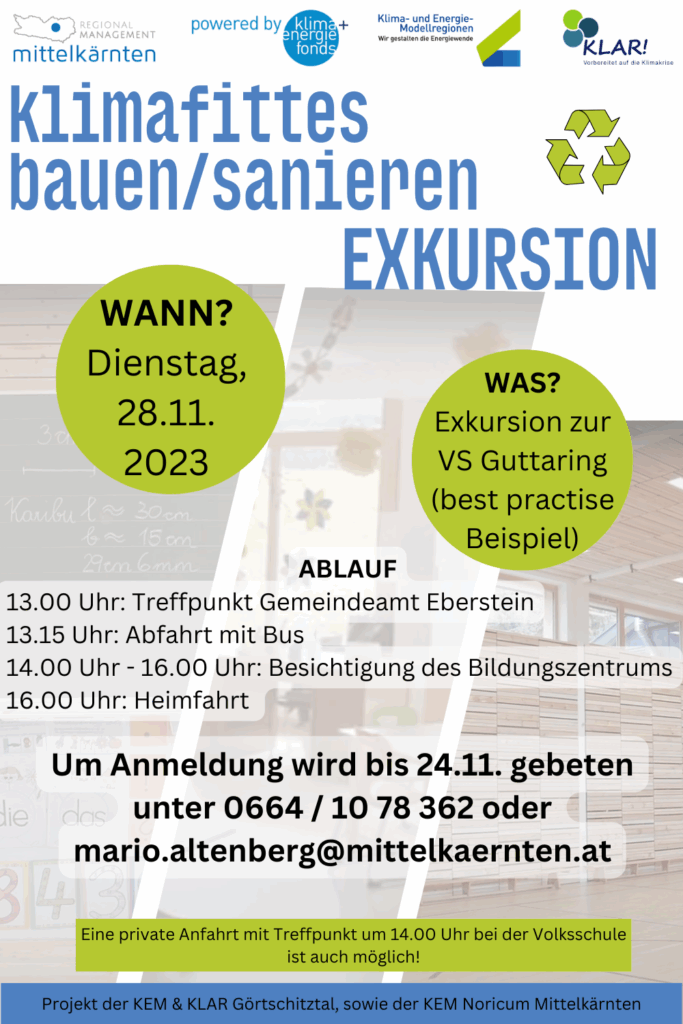 Am Dienstag, 28. November 2023 um 14:00 Uhr findet eine Exkursion zum dem Bildungszentrum in Guttaring, welches als best-practise Beispiel für klimafittes Sanieren gilt. Die Exkursion wird von den Kärntner Klima- und Energie-Modellregionen (KEM) Görtschitztal und Noricum Mittelkärnten in Kooperation mit den Klimawandelanpassungsmodellregionen (KLAR!) Görtschitztal angeboten.