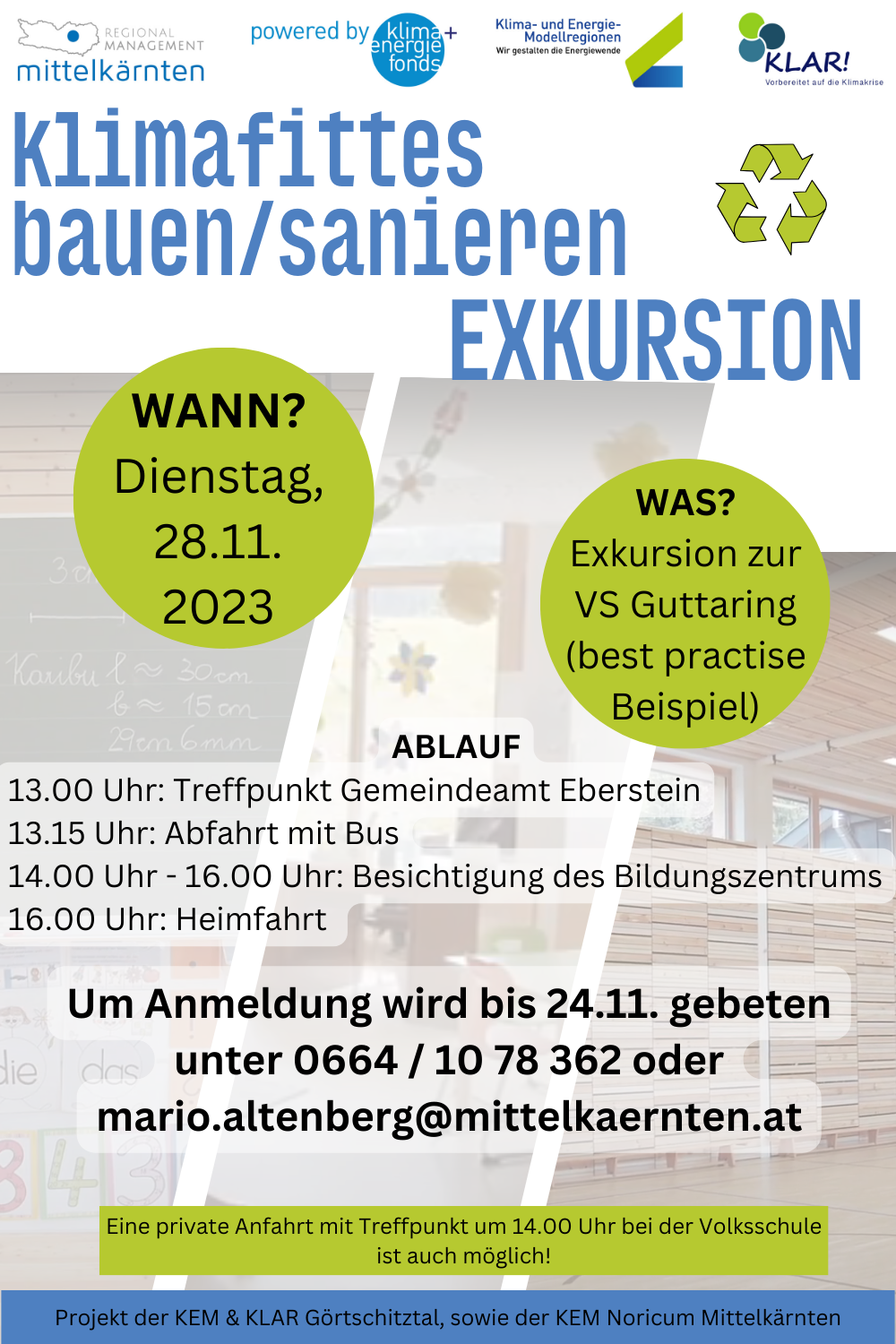 Am Dienstag, 28. November 2023 um 14:00 Uhr findet eine Exkursion zum dem Bildungszentrum in Guttaring, welches als best-practise Beispiel für klimafittes Sanieren gilt. Die Exkursion wird von den Kärntner Klima- und Energie-Modellregionen (KEM) Görtschitztal und Noricum Mittelkärnten in Kooperation mit den Klimawandelanpassungsmodellregionen (KLAR!) Görtschitztal angeboten.