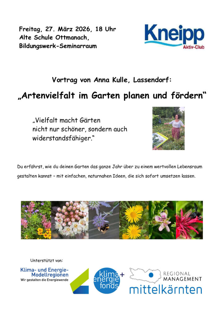 Am 27.03.2026 findet in der alten Volksschule Ottmanach um 18:00 Uhr ein spannender Vortrag zu klimafitten Garten und Steigerung der Artenvielfalt im eigenen Garten statt.